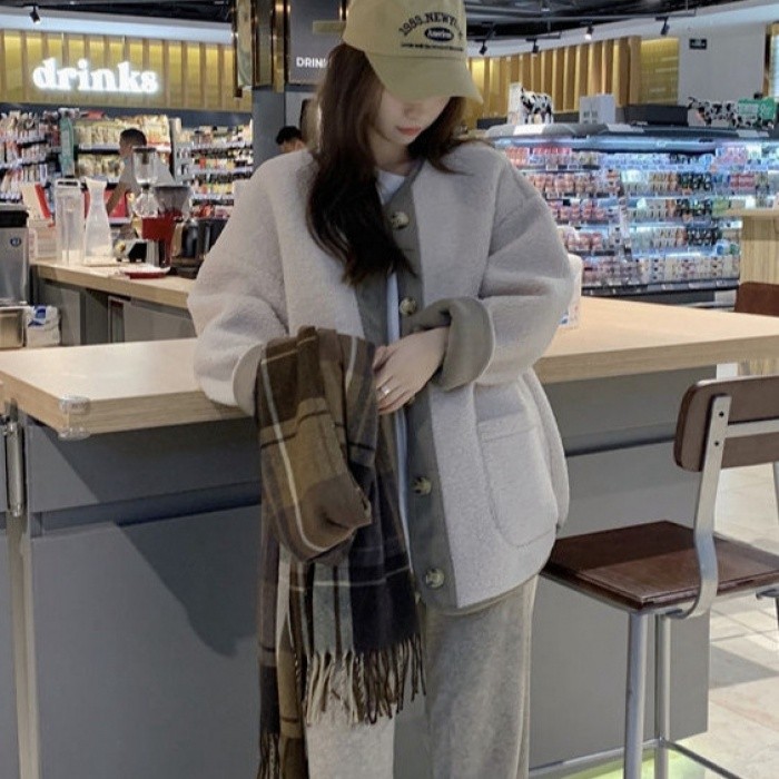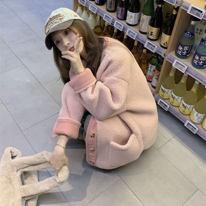 ✨【秋冬撞色仿羊羔絨開衫外套】新款圓領加厚設計 | 韓風時尚外套 | 寬鬆舒適 | 正韓小眾潮流 | 女士長袖外